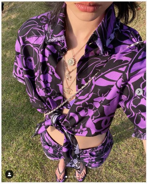 Yeon Jung tampil fresh and young dalam balutan busan fulll pattern berwarna ungu. Menggunakan kemeja bernuansa bunga-bunga warna ungu dengan mengikatnya pada bagian hemline dan dipadukan dengan celana pendek bermotif serupa membuatnya terlihat semakin stylish dan fashionable. Kasual tetapi tetap festive.