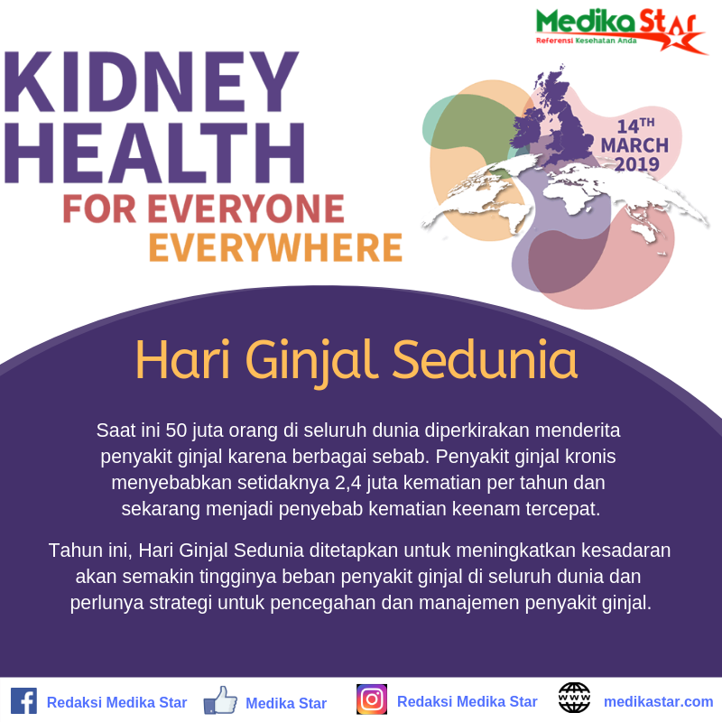 Terkait Ginjal, di setiap hari Kamis pada minggu kedua di bulan Maret diperingati World Kidney Day (WKD) atau Hari Ginjal Sedunia. Tahun ini, Hari Ginjal Sedunia jatuh pada tanggal 14 Maret 2019 dengan mengusung tema Kidney Health for Everyone and Everywhere.