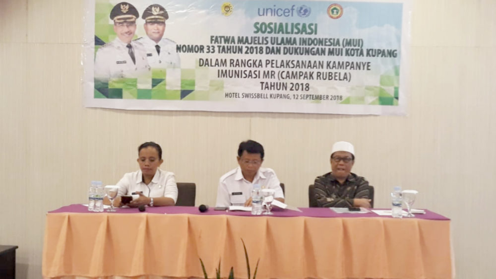 Kementerian Agama memberikan dukungannya terhadap pelaksanaan Imunisasi MR di Kota Kupang. Dukungan ini disampaikan dalam kegiatan sosialisasi Fatwa MUI tentang Imunisasi Measles Rubella (MR) tingkat Kota Kupang. Sosialisasi ini dilaksanakan di Hotel Swiss Belin, Rabu (12/09/18). Hadir pada kesempatan tersebut, dr. I Wayan Ari Wijana S. Putra, M.Si, Kepala Dinas Kesehatan Kota Kupang; Sri Wahyuningsih, S.KM, M.Kes, Kepala Bidang P2P Dinkes Kota Kupang; dan juga H. Muhammad, Ketua MUI Kota Kupang.