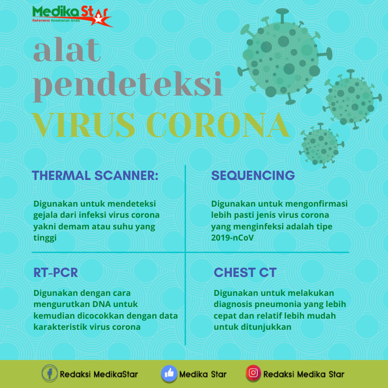 Cara mendeteksi virus corona tentunya harus menggunakan alat-alat yang disesuaikan dengan prosedur dari World Health Organization (WHO). Terdapat beberapa alat yang dapat digunakan dalam mendeteksi virus tersebut. Alat-alat ini sudah dimiliki oleh banyak negara, termasuk Indonesia.