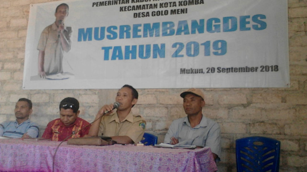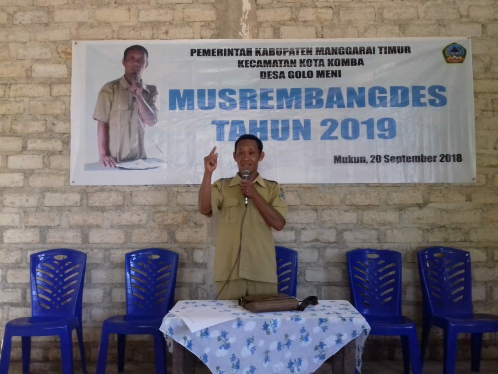 Dalam rangka penyusunan anggaran pendapatan dan belanja desa, maka Desa Golo Meni  Kecamatan Kota Komba, Kabupaten Manggarai Timur menggelar kegiatan Musrenbangdes tahun anggaran 2019. Kamis (20/09/2018), kegiatan ini berlangsung dia aula Kantor Desa Golo Meni.