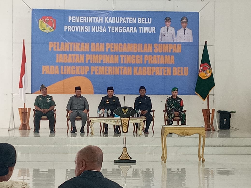 Bupati Belu dr. Agustinus Taolin, SpPD-KGEH, FINASIM melantik dan mengambil sumpah jabatan pimpinan tinggi pratama pada lingkup pemerintah kabupaten Belu di aula gedung wanita bête lalenok, Atambua (129/12/23). Kepala dinas yang dilantik yakni Simplisius V. Dalung, ST sebagai kepala dinas PUPR, Robertus Y. Mali, SP sebagai Kadis Pertanian dan Ketahanan Pangan, Blasius Manek Lonis, S.Sos Inspektur pada Inspektorat, Rosalia Yeani E.R. Lalo, SH sebagai kepala DPMPTSP.