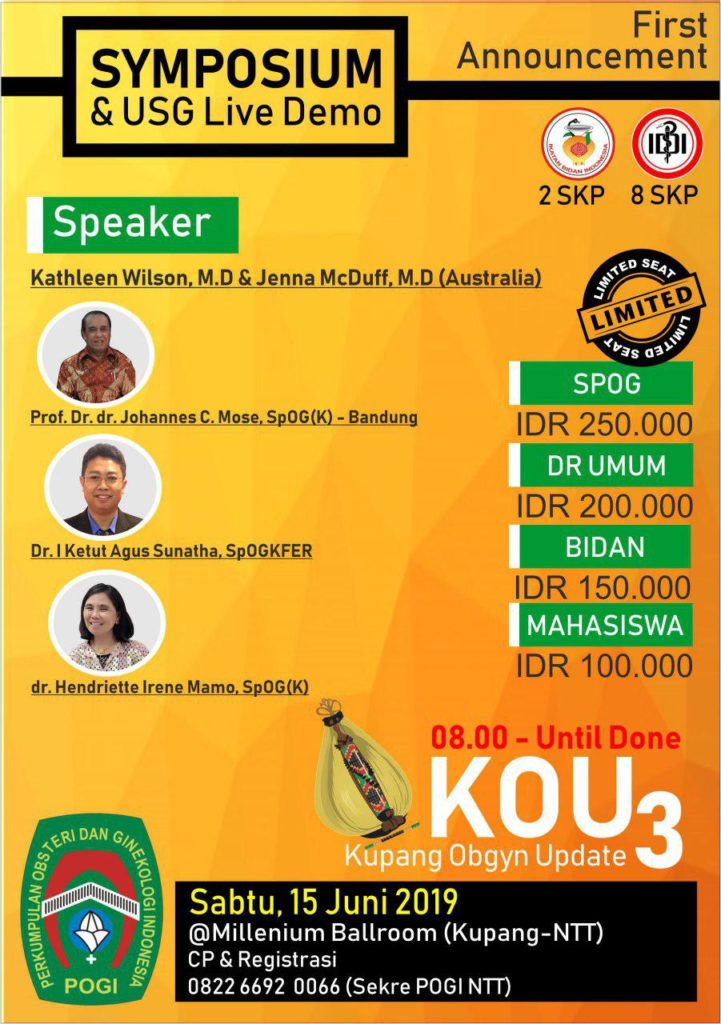 Dalam rangka meningkatkan dan mengupdate ilmu pengetahuan, khususnya di bidang obstetri ginekologi para dokter spesialis obstetri ginekologi, dokter umum, dan juga bidan, maka Perkumpulan Obstetri dan Ginekologi Indonesia (POGI) Provinsi NTT akan menggelar kegiatan ilmiah, “Kupang Obstetri Ginekologi Update” (KOU) Ketiga. Kegiatan ini akan berlangsung pada Sabtu (15/06/19) mendatang di Millenium Ballroom, Kota Kupang.