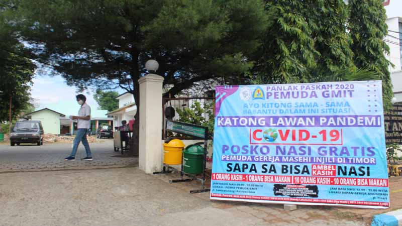 Sudah memasuki minggu keempat Posko Nasi Gratis yang dijalankan para Pemuda GMIT (Gereja Masehi Injili di Timor) beroperasi. Setiap hari, sejak jam 12 sampai jam 3 sore, posko yang terletak di depan Gereja Anugerah El Tari Kupang tersebut melayani siapa saja yang kesulitan mendapatkan makanan.