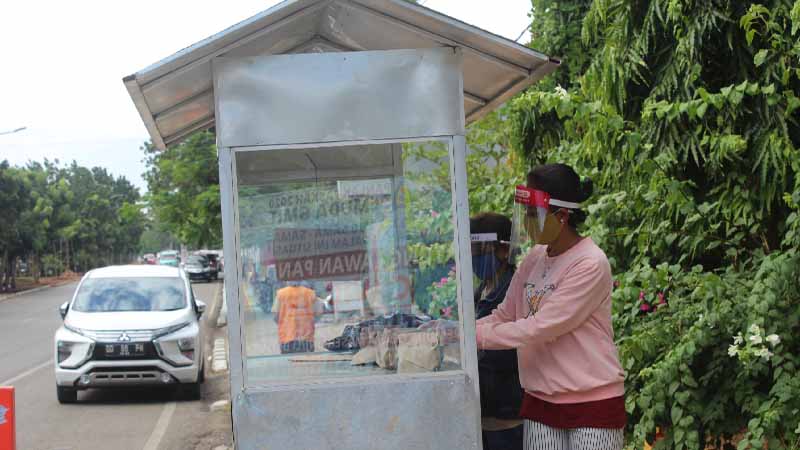 Setelah mencuci tangan, mereka diarahkan menuju kereta yang diparkir di trotoar depan gereja. Dua orang wanita muda yang dilengkapi masker, face shileld mask (pelindung wajah), dan handscoon (sarung tangan), bertugas membagi nasi bungkus.