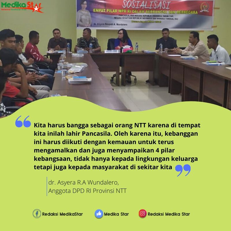 Mengingat para peserta sosialisasi tersebut merupakan generasi milenial yang berasal dari NTT, dr. Asyera mengutarakan bahwa masyarakat NTT perlu berbangga dengan 4 pilar kebangsaan tersebut, khususnya Pancasila. Pancasila merupakan salah satu dari 4 pilar kebangsaan yang lahir dari buah permenungan Soekarno saat tengah diasingkan di Ende, Flores.