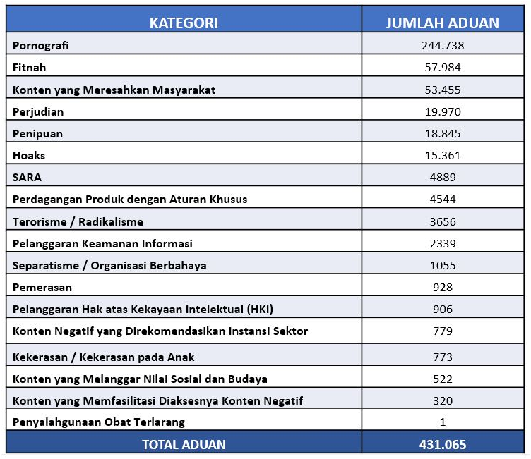 Sepanjang tahun 2019, Kementerian Kominfo menerima 431.065 aduan masyarakat terkait konten bermuatan negatif yang diterima melalui laman aduankonten.id, email aduankonten@kominfo.go.id, maupun melalui akun Twitter @aduankonten.