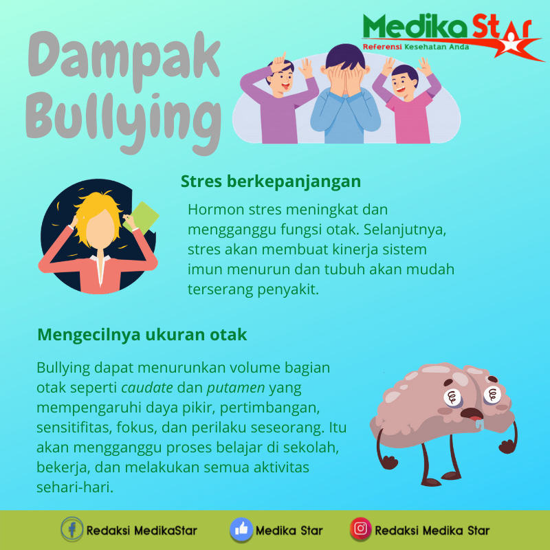 Apapun jenisnya, bullying dapat mengakibatkan terjadinya gangguan pada otak. Gangguan tersebut dapat berupa gangguan mental dan pengecilan ukuran otak.